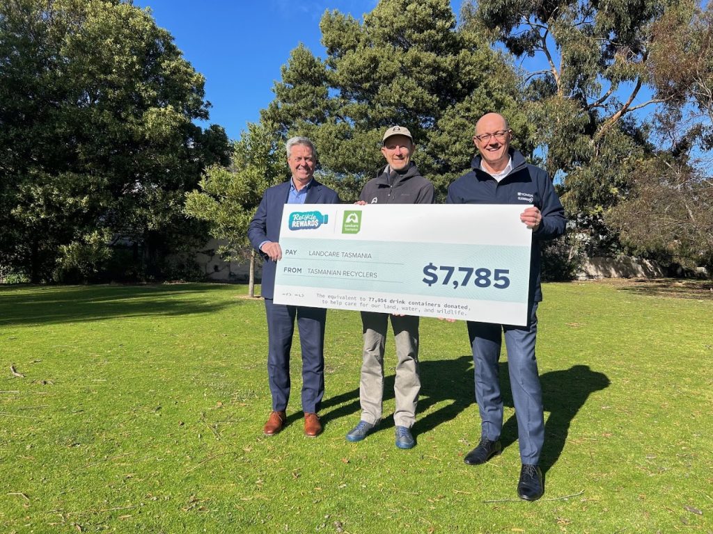 Recycle Rewards has marked a major milestone in its community impact journey, presenting Landcare Tasmania with a cheque for $7785 for its time as the container refund scheme’s first major donation partner.